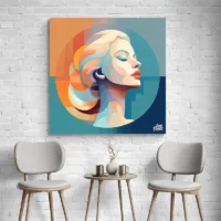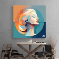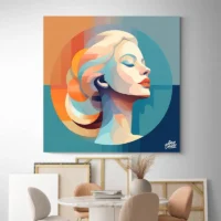 Ce Tableau Art Femme montre un visage de femme en trois-quarts, posé au centre. Un trait noir souligne les contours, précis et expressifs. On voit des aplats de couleur ocre et bleu qui contrastent avec un fond crème. Les cheveux forment des volumes simples, le regard reste calme, presque méditatif. La composition reste simple, presque minimaliste. On ressent une présence douce, une présence discrète, qui attire sans crier.