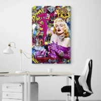 Ce Tableau Art Pop frappe par son énergie visuelle, on retrouve un visage stylisé en gros plan, des aplats de couleurs vives et des contours noirs marqués. Le fond jaune apporte de la lumière, le rouge vif des lèvres capte le regard, et des touches de bleu et de rose ponctuent la composition. On voit aussi des points en motif qui rappellent la technique pop, ainsi qu’un regard direct qui donne du caractère.