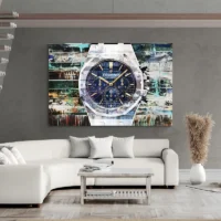 Ce Tableau Audemars Piguet montre un gros plan sur un garde-temps très net. On voit un boîtier métallique poli, une lunette facettée avec des vis visibles, et un cadran sombre à la texture subtile. Les aiguilles et les index lumineux ressortent sur le fond, la couronne se devine sur le côté. L’ensemble donne un rendu précis, très soigné et très immédiatement reconnaissable.