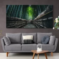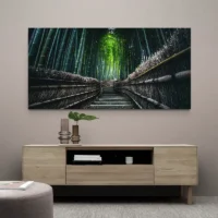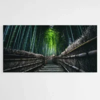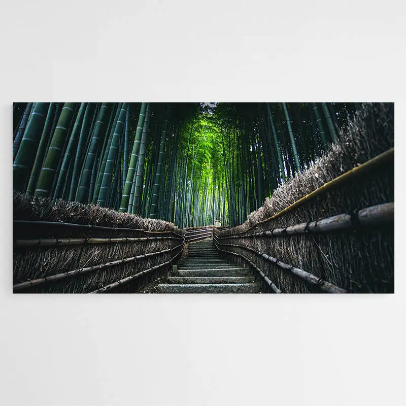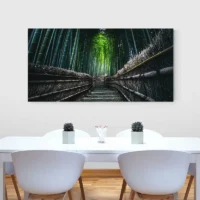 Ce Tableau Bambou montre des tiges de bambou verticales très présentes, des feuilles fines et délicates qui partent en balancement, et un fond clair, presque blanc cassé, qui laisse respirer la composition. Les nuances de vert vont du vert profond au vert pâle, et les troncs affichent des lignes nettes et régulières. On voit une composition simple, épurée, une image qui reste calme, calme.