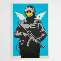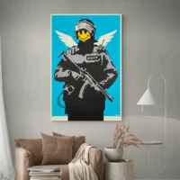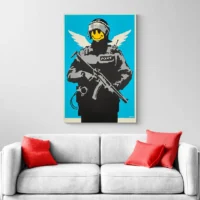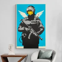 Le Tableau Banksy Police montre une silhouette noire d’un agent en pochoir, une casquette bien visible, le bras levé avec une matraque. Le fond reste clair, avec des traces de peinture et des éclaboussures qui donnent de la matière. Les contours restent nets, parfois un peu effacés, et on voit la texture du mur et des zones de peinture qui bavent.