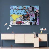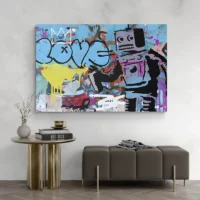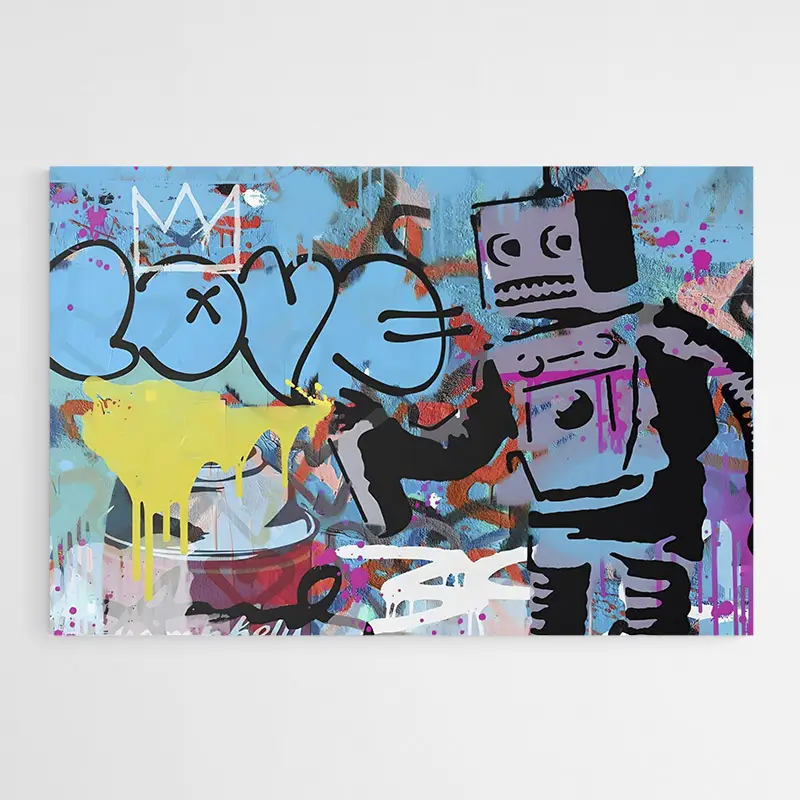 Le Tableau Banksy Robot montre un petit robot en pochoir, silhouette noire posée sur un fond crème légèrement texturé. On remarque des traits nets, des nuances de gris autour des contours, et un rendu qui rappelle le mur urbain. L'image garde une économie de moyens: peu de couleurs, volume suggéré par quelques ombres, un contraste franc entre le motif et le fond.