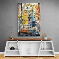 On découvre un portrait stylisé au centre, un visage-masque encadré par des traits noirs épais. Des touches de rouge vif, de jaune ocre et de bleu ponctuent la composition. Une petite couronne à trois pointes sur la tête ajoute un repère visuel, et des écritures griffonnées entourent le motif, comme des marques rapides. Le fond paraît texturé, beige et ocre, avec des éclaboussures de blanc qui accrochent la lumière. Ce Tableau Basquiat Afrique frappe par son contraste, par son énergie, par son rythme, vraiment.