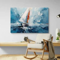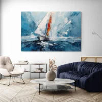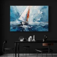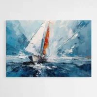 La simplicité des formes et la palette limitée créent une sensation apaisante. On sent immédiatement une atmosphère marine, tranquille et lumineuse. Ce tableau séduira les amateurs de mer, de navigation, et ceux qui aiment les images graphiques et claires. Les contrastes entre la voile blanche et la coque sombre attirent le regard sans en faire trop.