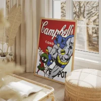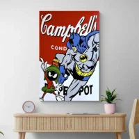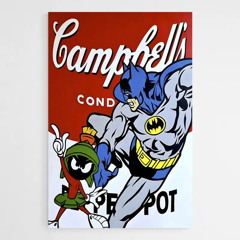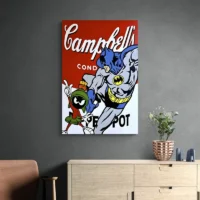 Le Tableau Batman Campbell affiche un portrait de Batman en gros plan, sur un fond rouge vif. Le masque noir occupe le centre, avec des yeux blancs très graphiques. Une boîte de soupe Campbell, blanche et rouge, apparaît à droite, le mot Campbell bien lisible. On remarque aussi des touches jaunes autour du visage et des lignes épaisses qui découpent la composition. Les couleurs sont franches, les formes simples, l’image frappe tout de suite. On sourit, on est surpris, on revient souvent le regarder.