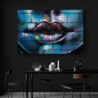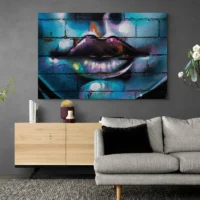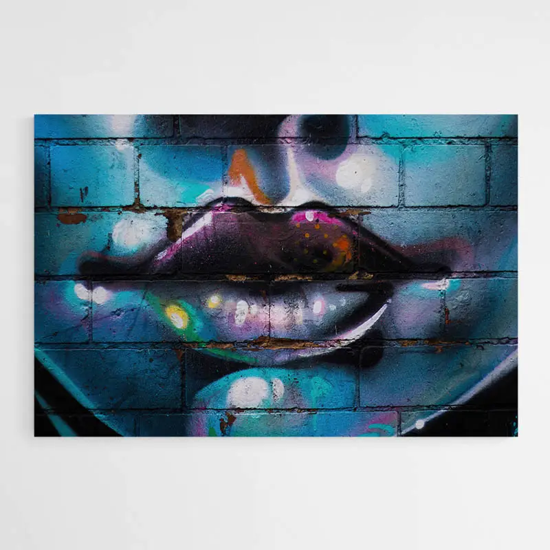 Le Tableau Bouche Street Art donne un choc visuel immédiat. On voit une bouche en gros plan, des lèvres rouge vif, des dents blanches bien visibles et des éclaboussures de peinture autour. Des traits de spray et des gouttes ajoutent une texture urbaine. Le contraste fort entre les couleurs et les zones noires crée une présence très directe.
