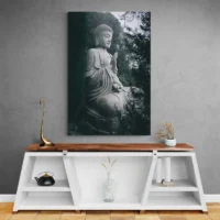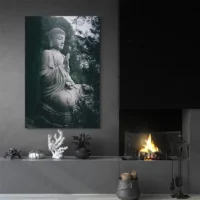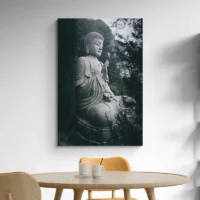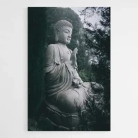 Ce Tableau Bouddha Extérieur montre une statue de Bouddha en pierre, posée dans un décor extérieur. On voit la texture patinée de la pierre, des traces de mousse sur la base, et des feuilles vertes qui encadrent le sujet. L'arrière-plan reste flou, avec des touches de lumière douce qui traversent le feuillage. Le rendu garde un équilibre entre matière brute et calme.