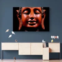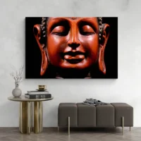 Ce Tableau Bouddha Rouge affiche un visage de Bouddha en gros plan sur un fond rouge profond. On voit des yeux fermés, une expression sereine, des traits du visage nets et épurés. Le rouge domine, avec des zones plus sombres qui créent du contraste et un léger rendu texturé sur la toile. On ressent tout de suite le calme, et pourtant l'image reste très vive, oui vive.