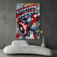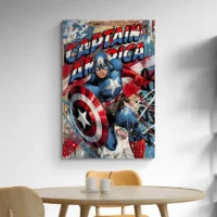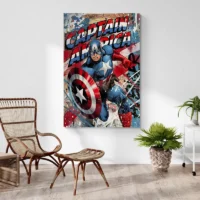 Ce tableau attire le regard avec un costume bleu vif, un casque bleu marqué d’un A blanc, et un bouclier rond orné d’une grande étoile blanche au centre entourée d’anneaux rouges et bleus. On voit aussi une étoile blanche sur la poitrine du personnage. Le fond reste sombre, presque noir, ce qui fait ressortir les rouges et les bleus. Le Tableau Captain America joue sur le contraste, net et direct.