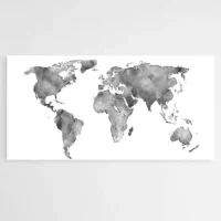 Ce Tableau Carte du Monde Gris montre la silhouette du monde en nuances de gris. On voit des continents en gris foncé sur un fond gris clair. Les contours restent nets, sans couleurs vives. L'impression offre une simplicité qui calme l'espace et attire le regard par la forme des masses terrestres.