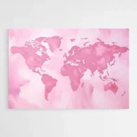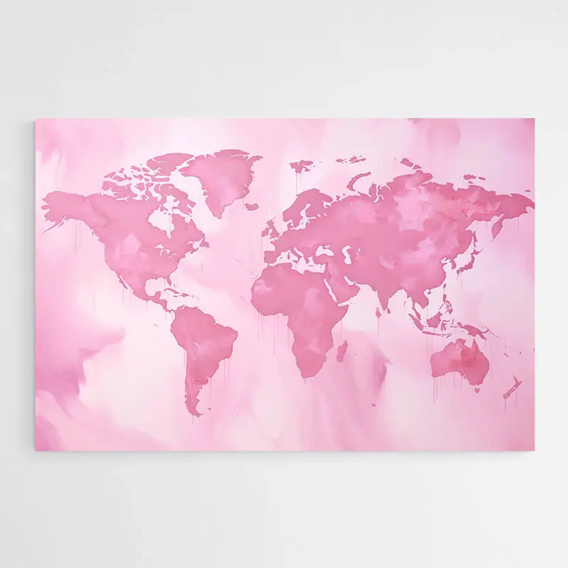 Ce Tableau Carte du Monde Rose montre une silhouette du monde en rose, posée sur un fond très clair. On voit les continents dessinés de manière épurée, sans texte ni repères, juste des formes reconnaissables. Les nuances de rose restent délicates, des tons plus soutenus sur certaines zones et des tons plus pâles ailleurs. L'ensemble donne une impression légère et graphique, simple et apaisante.