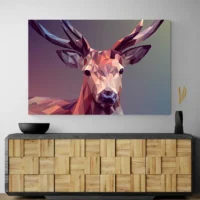 Ce Tableau Cerf Design montre une tête de cerf stylisée, des bois imposants et des formes géométriques qui composent le dessin. Le sujet se détache sur un fond sombre, avec un contraste net entre les volumes et l'espace vide. On voit des lignes nettes, des surfaces planes et un rendu épuré, presque minimaliste. Le regard se fixe sur les bois qui montent, et sur la simplicité du visage, simple mais expressif.
