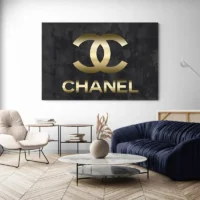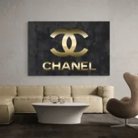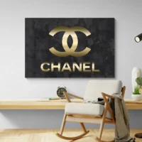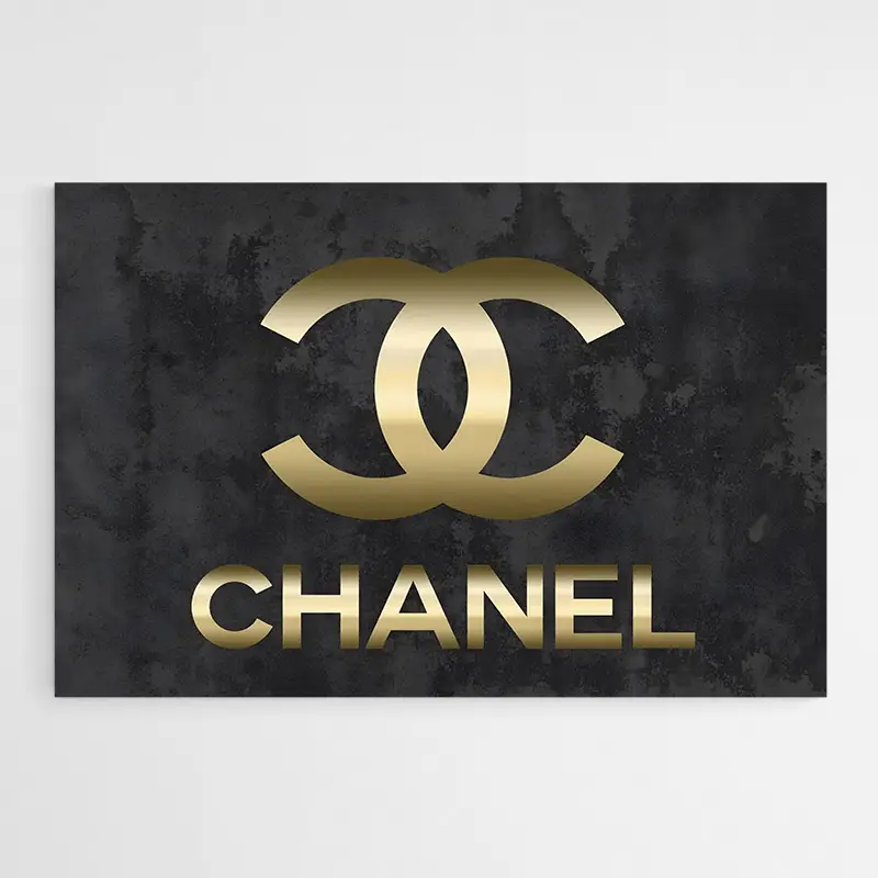 Ce Tableau Chanel Dore affiche un logo double C doré sur un fond noir profond. On voit les lettres CHANEL en-dessous, elles brillent comme du métal. Des touches de doré plus claires créent des reflets et quelques éclaboussures apportent du relief. L'ensemble garde une esthétique nette, très contrastée, qui attire l'œil.