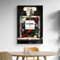 Ce tableau montre un flacon de parfum en gros plan, posé au centre, entouré de fleurs délicates. Le verre du flacon reste net, l’étiquette affiche clairement le N°5 et le bouchon apparaît comme un petit rectangle sombre. Les fleurs, aux tons roses et blancs, encadrent le flacon et créent un contraste doux avec le fond clair. On nomme ce tableau Tableau Chanel N5 Fleurs et on ressent tout de suite une atmosphère élégante et féminine.
