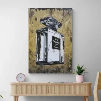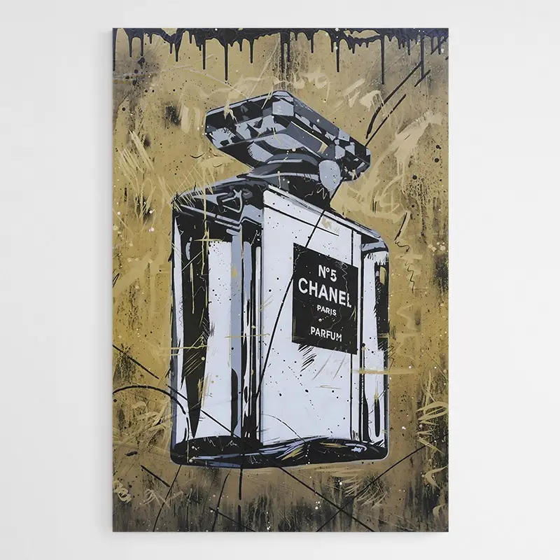 Ce tableau Chanel Parfum Noir et Or montre un flacon de parfum posé au centre sur un fond noir profond. On distingue une silhouette rectangulaire du flacon, un bouchon doré et une étiquette claire qui tranche. Des touches d'or scintillent autour, comme des éclaboussures métalliques et des reflets sur le verre. L'image joue sur le contraste entre le noir mat et les accents or brillants, elle donne une allure précieuse, élégante, très chic.