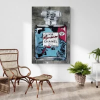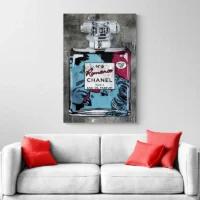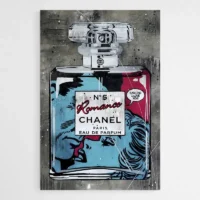 On ressent immédiatement une énergie légère et complice. Le mélange de rose, de rouge et de blanc évoque l’amour et la séduction. Les traits noirs, parfois épaissis, rappellent la bande dessinée ou l’estampe populaire. Ce tableau plaira aux amateurs de parfums iconiques, aux fans d’images colorées, et à qui aime un mur qui sourit.