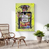 Le contraste fort entre le noir du flacon et les nuances plus claires du fond crée une présence immédiate. Les taches et les traits donnent un esprit urbain, un côté énergique et assumé. Ce tableau plaira aux amateurs d’art de rue, à ceux qui aiment les références de mode et les images qui frappent, voilà qui capte l’œil, qui accroche, qui reste.