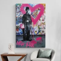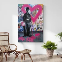 Le rendu évoque le street art classique: traits frappants, effet pochoir et présence graphique. Ce tableau plaira aux amateurs de cinéma, aux admirateurs de Charlie Chaplin et à ceux qui aiment une déco avec du caractère. L'effet recherché: apporter de la présence au mur, renforcer un coin avec une pièce forte qui raconte quelque chose, qui parle au visiteur.