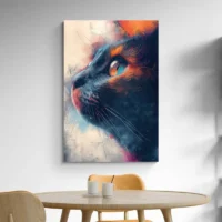 Sur un mur clair les couleurs ressortent fort. Sur un mur sombre, le tableau devient point focal. Associez-le à un cadre noir fin ou à des coussins unis dans une des couleurs présentes. Pour compléter votre décor, découvrez aussi nos tableaux chat et nos tableaux pop-art.