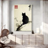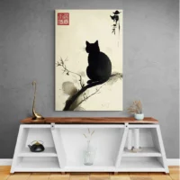 On sent une atmosphère calme et presque graphique. Le rendu combine douceur des fleurs et force du cercle rouge, une image qui plaira aux amateurs de décoration d'inspiration japonaise et aux amoureux des chats. Ce tableau cherche à apporter une touche sereine, un petit souffle contemplatif dans une pièce.