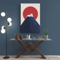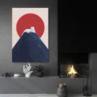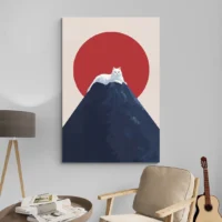 Ce Tableau chat Mont Fuji montre un chat en premier plan, la montagne emblématique avec un sommet blanc, et un grand disque rouge dans le ciel. Les formes restent simples, les contours nets et la composition place le chat face à la montagne. Le fond paraît dégagé, l’ensemble donne une impression de calme. On remarque aussi des lignes horizontales qui structurent l’image et un contraste marqué entre les éléments.