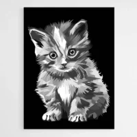 Ce Tableau Chat Noir et Blanc montre un gros plan d’un chat aux poils noirs et blancs, sur un fond clair. On voit le visage net, les moustaches fines, les oreilles dressées et un contraste fort entre zones sombres et zones claires. L’image donne une impression précise, presque minimaliste, avec des détails de la fourrure bien visibles et une silhouette nette.
