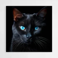 Ce Tableau Chat Noir Yeux Jaunes propose un gros plan sur le visage d’un chat noir. On voit un pelage noir profond, des yeux jaunes très ronds qui captent la lumière, des oreilles dressées et un museau sombre bien dessiné. Le regard reste fixe, presque hypnotique, il attire et retient l’attention. La composition se concentre sur le portrait, sans élément distrayant, simple et puissant.