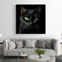 Ce Tableau Chat Noir Yeux Verts s'impose par son sujet simple: un chat au pelage noir, des yeux verts très marqués et un regard qui fixe l'objectif. On voit nettement la texture sombre du pelage, la couleur verte vive des iris, et une expression intense qui retient l'attention. L'image reste claire, directe, presque silencieuse.