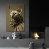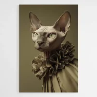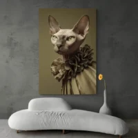 Ce Tableau chat sphynx élégant frappe par sa présence. On voit un chat sans poils, la peau plissée et mate, des grandes oreilles pointues et des yeux en amande qui regardent droit devant. Le fond sombre met le sujet en valeur. La lumière marque les contours, on devine des ombres fines sur le cou. L’ensemble reste très épuré, sobre, presque cérémonieux.