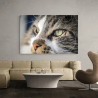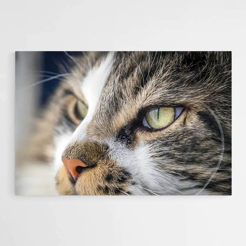 Tableau Chat Yeux Verts montre un gros plan sur un chat. On voit des yeux verts lumineux et très présents. Le cadrage met le visage au centre, la composition reste nette, intime. On sent la présence, le calme et l'attention du chat. On ressent aussi une proximité presque tactile.