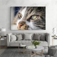 On remarque trois choses qui sautent aux yeux: les yeux verts, les longues moustaches et la texture du pelage, avec des poils bien définis autour du museau. Le regard fixe donne de la force. L'image utilise des contrastes marqués entre les zones claires et les zones sombres, ce qui accentue l'expression. C'est une pièce qui plaira aux amoureux des chats et aux personnes qui cherchent une déco chaleureuse.