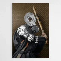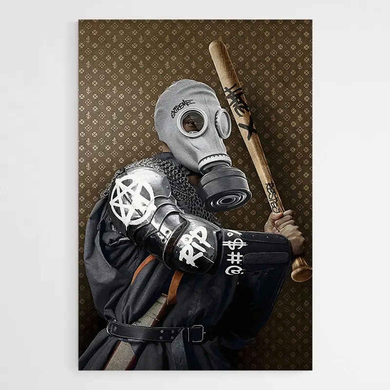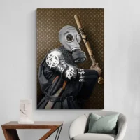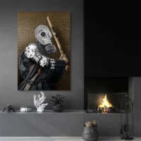 Les formes nettes, le contraste noir et gris, et les traits blancs donnent un rendu graphique, presque illustratif. On ressent une présence calme, une sorte de sérieux contemporain. Ce tableau plaît à ceux qui aiment les visuels masculins, les silhouettes armées, ou simplement un rendu épuré et affirmé.