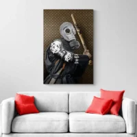 Ce Tableau Chevalier Moderne présente un personnage en armure au rendu épuré. On distingue un casque lisse avec une visière sombre, un plastron aux lignes géométriques et des épaulettes marquées. Le fond reste sobre, texturé en gris foncé, avec des touches de blanc qui créent du contraste. L’image dégage une allure à la fois sobre et puissante, oui, sobre et puissante.