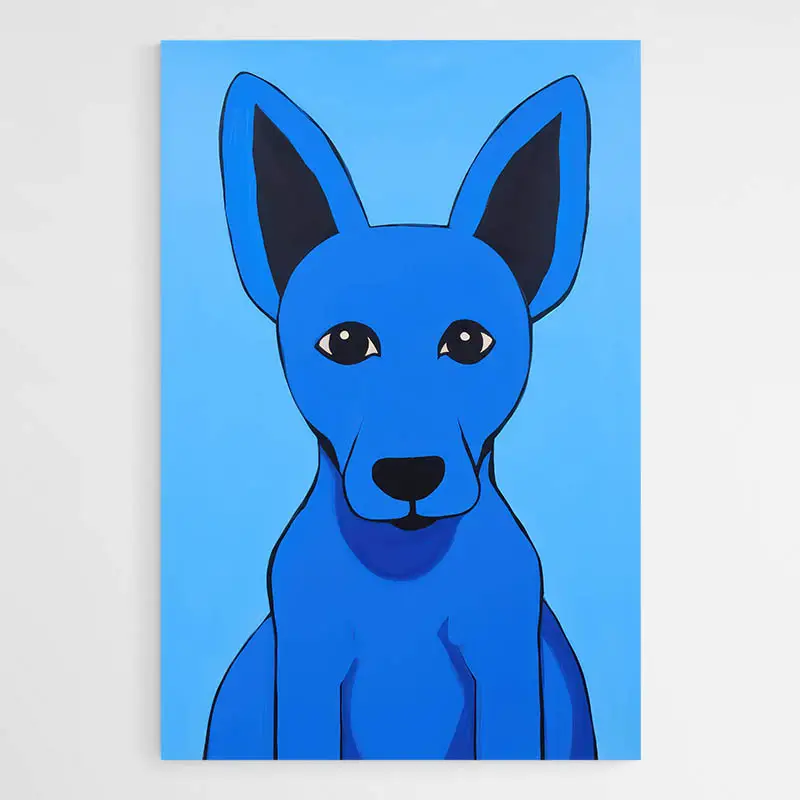 Le rendu reste simple et moderne, avec des touches de bleu profond et de bleu clair qui créent du contraste. Il séduira tous ceux qui aiment les portraits d'animaux, les chambres d'enfant, ou un salon où l'on veut apporter une note vive sans en faire trop. L'effet recherché : chaleur, proximité, un petit côté espiègle qui fonctionne bien.