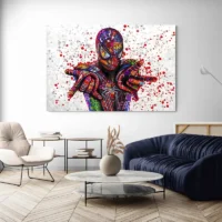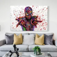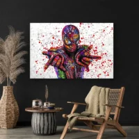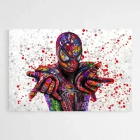 Ce Tableau Colore Spiderman montre un gros plan du masque du héros. Le rouge domine la surface, des lignes noires dessinent le motif de toile d'araignée, les yeux blancs ressortent très nets. L'arrière-plan mêle des aplats bleus et des touches jaunes, avec des éclaboussures et des coups de pinceau visibles qui donnent du mouvement. Les contours restent francs, le contraste entre couleurs vives et noir crée un rendu très graphique.