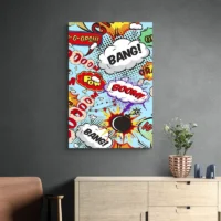 Ce Tableau Comics frappe par son énergie visuelle. On voit un motif central marqué, des couleurs vives rouge, jaune et bleu, et de larges traits noirs qui découpent la composition. Des points de trame rappellent l'impression des bandes dessinées. Une bulle de texte blanche et un mot en lettres épaisses apportent du rythme.