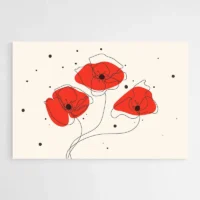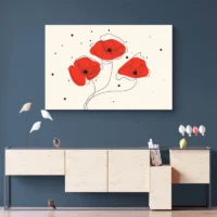 Ce Tableau Coquelicots attire par sa simplicité lumineuse et sa douceur bucolique. On découvre une scène où des coquelicots rouges se détachent sur un fond crème, des pétales délicats et des tiges fines vert émeraude dessinant un rythme vertical. Le dégradé vers un ciel bleu en haut apporte une respiration calme au regard. Cette composition respire la fraîcheur des journées d’été.
