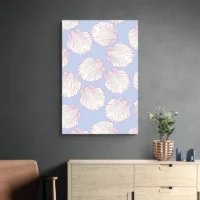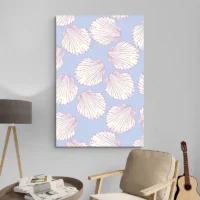 Ce Tableau Coquillages Moderne montre plusieurs coquillages en gros plan, disposés sur un fond crème. On voit des formes arrondies et striées, des tons sable, blanc cassé et un bleu très pâle qui joue en arrière-plan. De petites ombres soulignent le relief des coquillages, et des traits fins ajoutent une sensation de matière. L’ensemble reste épuré, lumineux et très calme, simple et apaisant.