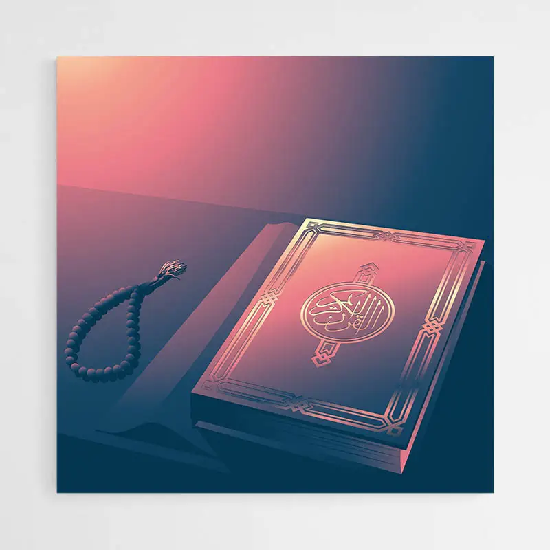 Ce Tableau Coran Moderne montre une grande calligraphie arabe au centre, tracée en traits généreux et sinueux. Le contraste attire : des lettres colorées sur un fond bleu profond, avec des touches dorées qui soulignent les formes. On voit aussi une bordure fine, claire, et de petits motifs géométriques qui rythment la composition. L'ensemble garde une allure sobre et soignée, calme et concentrée.