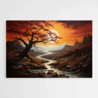 Ce Tableau Coucher de Soleil sur la Plage montre un soleil bas posé sur l'horizon, un ciel dégradé d'orange, de rose et de violet, et la mer qui capte la lumière en un long reflet. On voit une étendue de sable lisse et quelques vaguelettes qui viennent doucement caresser le rivage. L'ensemble donne une atmosphère chaude et apaisante, simple et vraie, simple et douce.