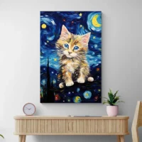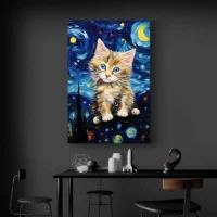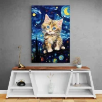 La toile joue sur le contraste entre les couleurs vives et les zones neutres. On ressent du plaisir, un sourire léger, une chaleur simple. Cette affiche plaira aux amateurs de chats, aux parents qui cherchent une touche douce pour une chambre d'enfant, ou à qui veut une déco légère et animée. C'est direct, c'est simple, ça accroche le regard.