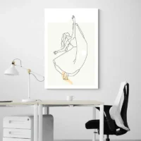 Ce Tableau Danse Minimaliste présente une grande silhouette tracée par des traits noirs fins sur un fond blanc cassé. On voit une figure élancée, des lignes courbes qui suggèrent un bras levé et une jambe étirée. L’espace vide autour accentue le mouvement, le contraste entre le noir des traits et la douceur du fond. On ressent une simplicité presque douce, simple et claire.