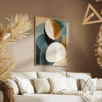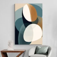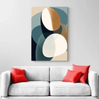 Ce Tableau Deco Design capte le regard avec une composition épurée. On voit des formes géométriques posées sur un fond clair. Des cercles et rectangles se superposent. Les tons dominants vont du beige au bleu profond, avec une touche de terracotta. La texture semble mate, les contours restent francs, sans fioriture. Le contraste entre une large surface pâle et des aplats colorés crée du mouvement.
