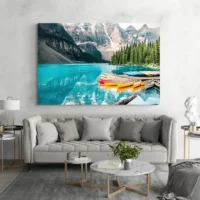Accrochez-la au-dessus d'un canapé clair ou d'une console en bois, accompagnez-la de coussins dans les tons sable et bleu, ou de plantes vertes pour contraster. Pour d'autres paysages, découvrez nos tableaux montagne ou nos tableaux paysage.