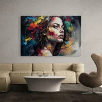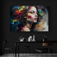 Le rendu joue sur le contraste entre le noir des contours et la douceur des teintes ocre et bleu. On ressent une atmosphère posée, presque méditative. Ce tableau séduira qui aime les portraits stylisés, les compositions épurées et les couleurs chaudes accompagnées de touches froides. Il apporte du caractère sans envahir la pièce.