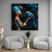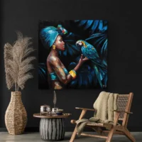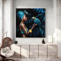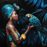 Tableau Femme Africaine et Perroquet, une scène lumineuse et chaleureuse
