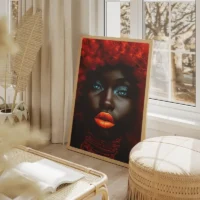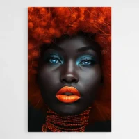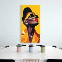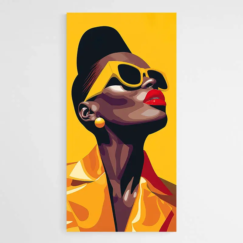Ce Tableau femme afro jaune frappe par sa présence. On y voit une femme à la coiffure afro volumineuse, un fond jaune uni et des teintes chaudes qui jouent le contraste. Le visage occupe l'espace, les contours restent francs, l'ensemble respire une énergie douce, presque intime. On le regarde et on revient, on s'attarde sur la matière visuelle.