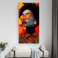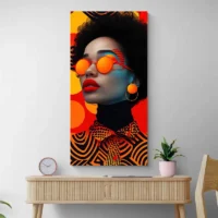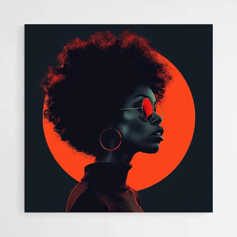 Le Tableau femme afro rouge montre un portrait féminin en gros plan. On voit des cheveux afro volumineux, un fond rouge profond et des traits épurés. Le visage reste simple, les lignes sont nettes, la silhouette du cou apparait. On ressent une présence, une force tranquille, intense. On sourit presque, on revient le regarder.