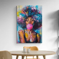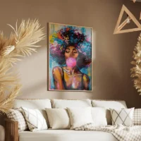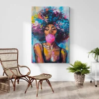 On découvre ce Tableau Femme Afro, une image qui respire la dignité et la couleur. Le visage est expressif, les cheveux bouclés encadrent un regard posé et la peau lumineuse reçoit des reflets subtils qui donnent de la vie à la scène. La matière visuelle est dense et sensuelle, comme si on pouvait presque toucher les tissus.