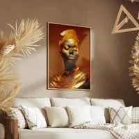 Le rendu évoque une élégance sobre, un mélange d’intimité et de présence. Ce tableau plaira à ceux qui recherchent une pièce centrale, un portrait aux accents contemporains et graphiques. L’effet recherché joue sur la lumière, la matière dorée capte le regard et garde une douceur malgré la forte présence visuelle.